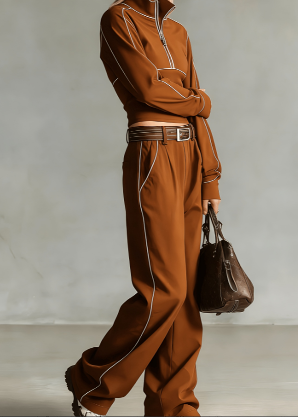 Stand-up Collar Short Zip-up Top Wide-leg Pants Casual Sportswear Set
