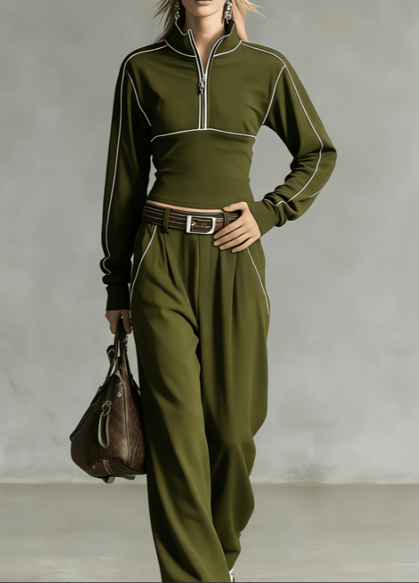 The top features a short stand-up collar and a half-zip design, which is slim-fitting and accentuates the waist;